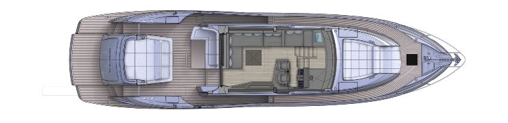 La piattaforma di poppa, movimentabile, facilita le operazioni di varo e alaggio dei water toys e crea un livello a filo acqua ideale per il bagno e gli sport nautici. I passavanti portano al ponte di prua, dove trova posto un secondo prendisole, più riservato, che diventa uno spazio privilegiato per il relax pomeridiano o per godersi l’ormeggio in rada lontano dalle zone più affollate.