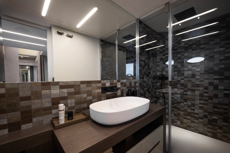 Cabine e materiali — Il lessico degli interni è fatto di superfici pulite, spigoli smussati, giunzioni invisibili. Tessuti e pelli sonore al tatto, metalli satinati, inserti in fibra: l’insieme restituisce una sensazione di solidità e coerenza. I servizi sono completi e rifiniti, con box doccia generosi e illuminotecnica studiata per scenari d’uso differenti.