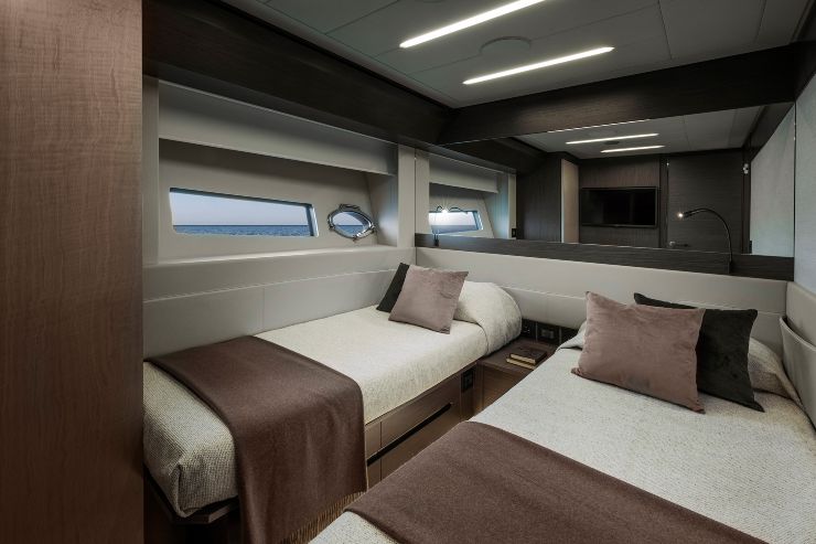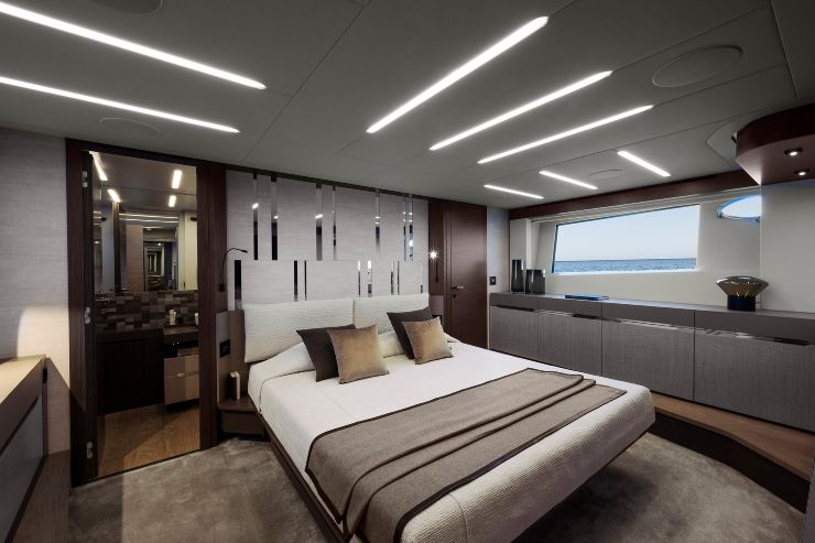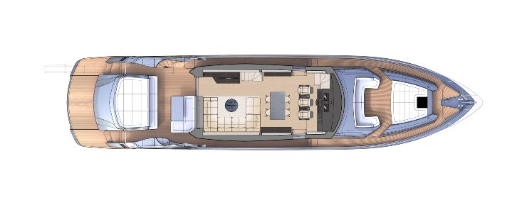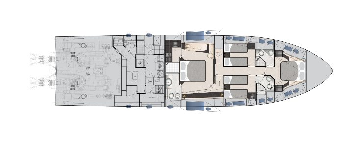 Distribuzione degli spazi — Il main deck preferisce volumi fluidi: area salone e zona pranzo sono pensate come un unico ambiente modulabile, mentre a prua una seconda stazione di comando in sport-fly consente di governare all’aria aperta. Sotto coperta la suite armatoriale full-beam a centro barca beneficia del baglio massimo; completano l’insieme una VIP e due cabine ospiti, tutte con servizi privati. Gli alloggi equipaggio sono separati e con accesso discretissimo.