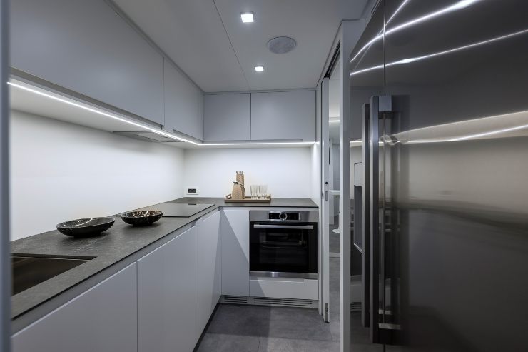 Automazione e sicurezza — Dalla climatizzazione alla gestione dei carichi elettrici, la domotica coordina scenari preimpostati (ormeggio, rada, crociera diurna, notte) e preserva le batterie con logiche di priorità. Allarmi di sentina e incendio sono integrati con sistemi d’estinzione dedicati alla sala macchine.
