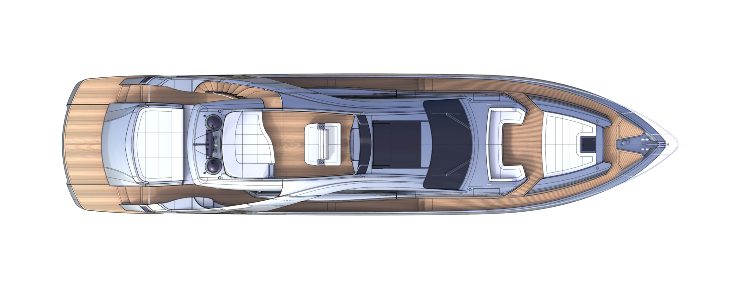 Aree sociali — Il pozzetto, protetto e modulabile, funge da salotto all’aperto con dinette e prendisole; a poppa, la beach area con garage integrato facilita la gestione del tender jet e dei water-toys. Il ponte superiore offre un ulteriore spazio conviviale con vista privilegiata sulla scia.