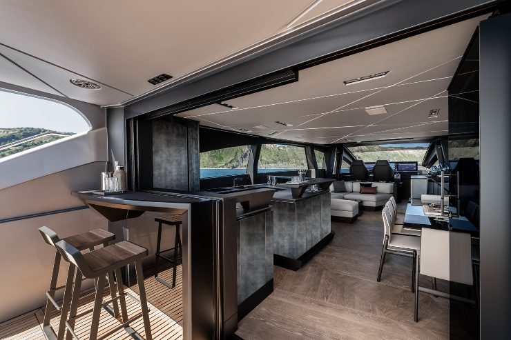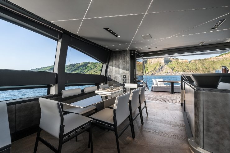 Molto riuscito il trattamento delle superfici vetrate. Le aperture ampliate e il rapporto tra pieni e vuoti consentono alla luce naturale di entrare con generosità, alleggerendo la percezione dei volumi interni. Questo ha un doppio effetto: all’esterno la barca appare meno massiccia, all’interno gli ambienti risultano più aperti e vicini all’acqua, con una qualità spaziale superiore a quella di molti sport yacht tradizionali.