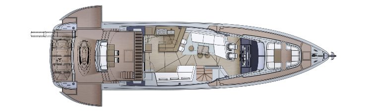 Il layout prevede quattro cabine ospiti per otto persone e una cabina equipaggio per due membri. La suite armatoriale è studiata con impostazione quasi residenziale, mentre le cabine guest mantengono proporzioni corrette e finiture coerenti con il segmento. Sul ponte principale, il rapporto tra salone e cucina aperta crea un ambiente molto contemporaneo, più conviviale, meno formale, pensato per una socialità fluida e rilassata.