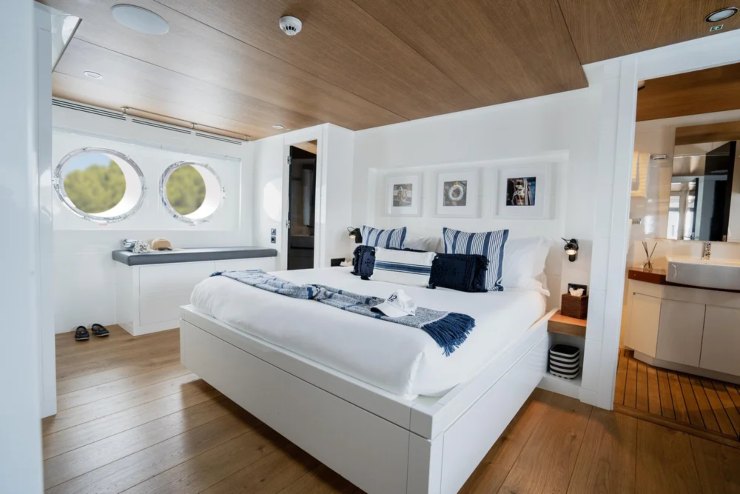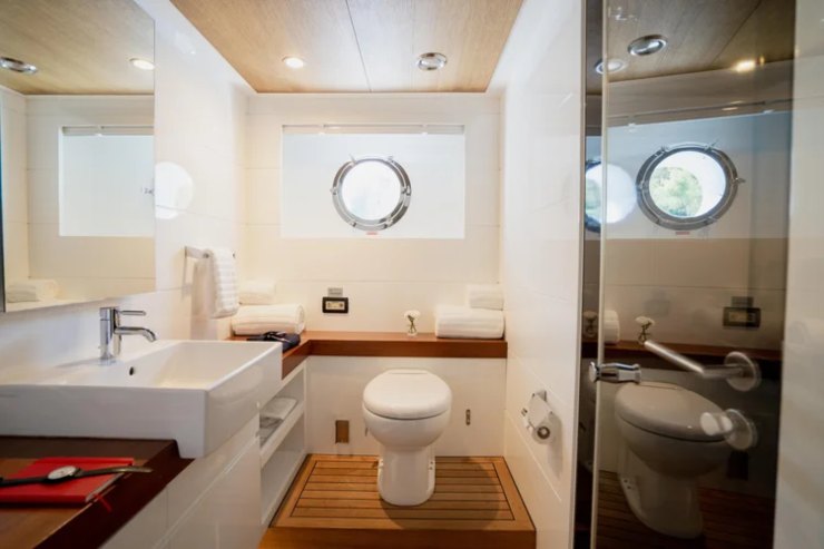 Gli interni seguono la stessa etica: layout logico, percorsi lineari, arredi free-standing Leggeri. Nel salone principale la continuità tra living e zona pranzo consente riconfigurazioni rapide. La suite armatoriale sul ponte principale è un vero vantaggio competitivo nel segmento perché separa il proprietario dagli ambienti inferiori, mentre il ponte notte accoglie due cabine VIP e due doppie/twin: in totale, cinque cabine per dieci ospiti. I bagni privilegiano box doccia ampi, finiture funzionali e illuminotecnica morbida.