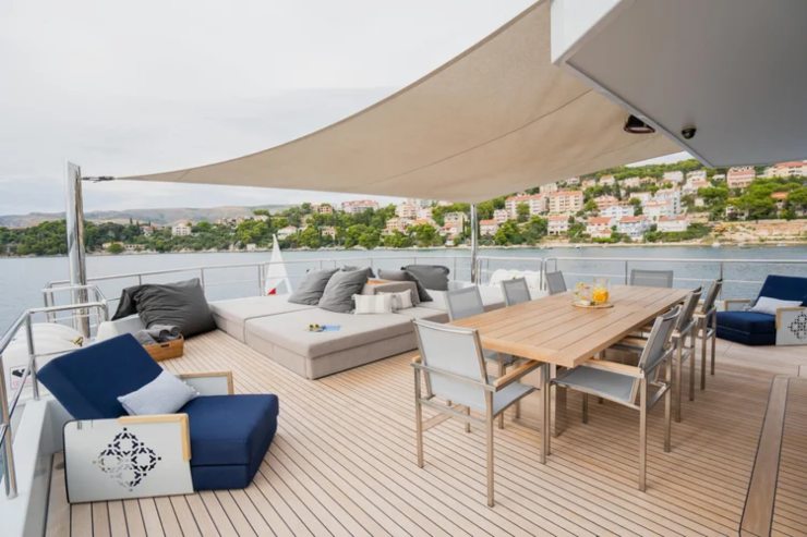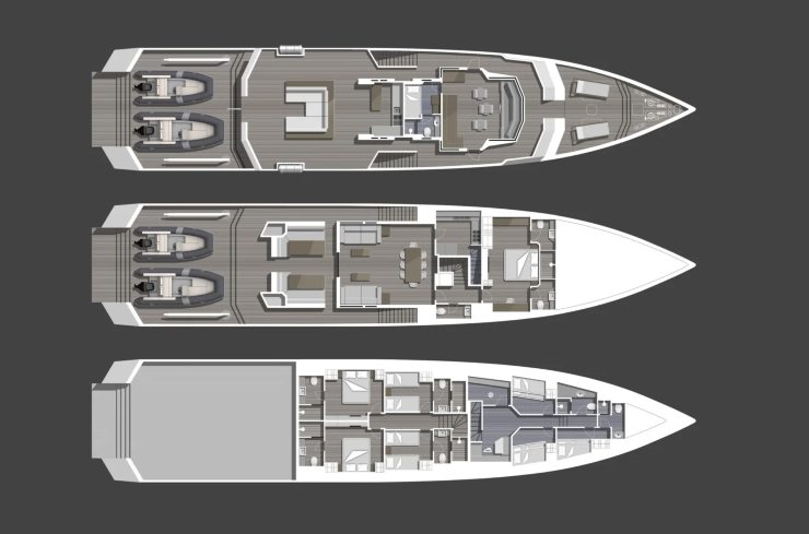 Il profilo esterno presenta tuga arretrata e parabrezza verticali: non è un vezzo stilistico, ma la conseguenza di un’idea d’uso. Con la massa “indietro”, il ponte di prua diventa davvero operativo: stivaggi, bitte in trazione, accessi simmetrici, handrail alti. A poppa, il main deck è un salotto all’aria aperta capace di trasformarsi in area pranzo, zona palestra o piattaforma per i giochi d’acqua. Il sun deck sovrasta con spazi modulabili e visuali pulite, mentre la plancia gode di percorsi laterali protetti indispensabili nelle manovre in banchina.