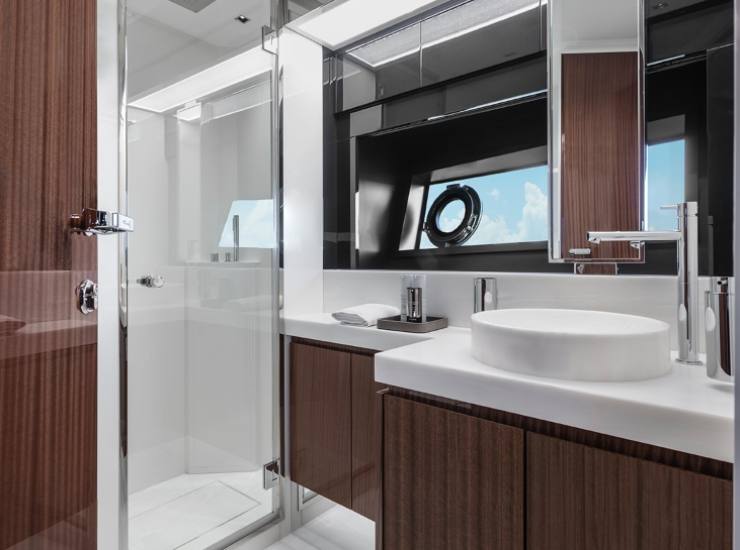 Sottocoperta, il Riva 76’ Bahamas Super adotta una configurazione a tre cabine tutte con bagno dedicato, affiancate da una cabina equipaggio a poppa con accesso indipendente: