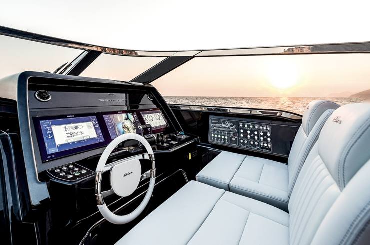 La plancia del 76’ Bahamas Super rappresenta un’evoluzione importante rispetto alla prima serie. Il layout è stato ridisegnato per rendere più intuitiva la lettura dei dati e più ergonomica la posizione di guida sia in piedi sia seduti. I principali parametri di navigazione sono integrati su display multifunzione touch, che permettono di configurare a piacere mappe, radar, dati motore e impianti.