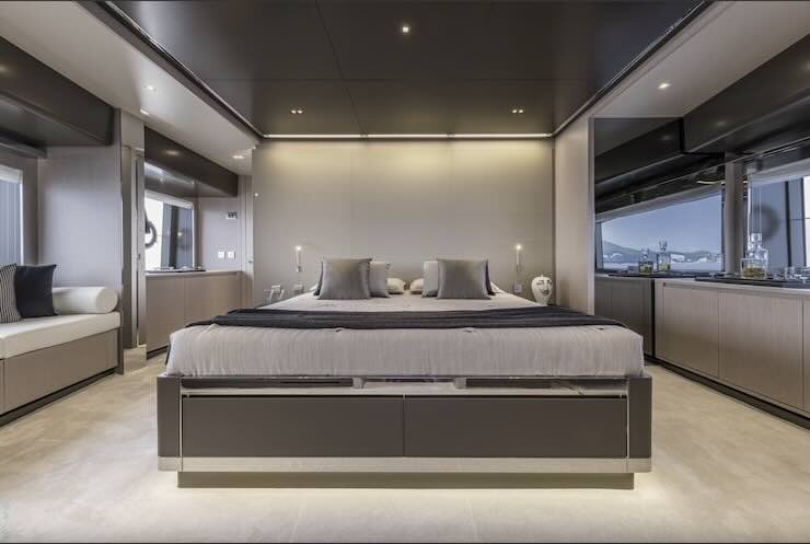 Il salone (circa 40 m²) sfrutta vetrate a tutta altezza, arredi free-standing e finiture “superyacht grade”. La suite armatoriale sul ponte principale occupa l’intero baglio: letto centrale, armadiatura passante, stanza da bagno con box doccia o bagno turco e opzione doppio lavabo. Sul ponte inferiore la zona notte ospiti può articolarsi in tre grandi cabine (inclusa una VIP full-beam) oppure in quattro, ricavando due matrimoniali e due doppie convertibili. L’equipaggio dispone di ingresso dedicato, mess, cucina di servizio e due cabine con bagni en-suite per 3–4 persone, così da preservare privacy e flussi separati.