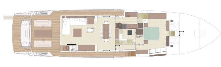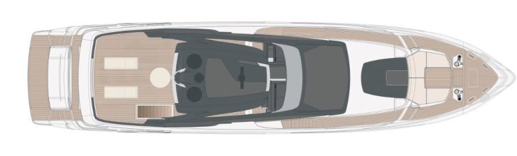 Il pozzetto può adottare layout europei o “American package” con bar e arredi Paola Lenti; le murate vetrate amplificano la percezione mar–bordo. Il flybridge (≈46 m²) integra bar unit, pranzo all’aperto e prendisole, con hard-top vetrato e parapetti trasparenti. A prua, area lounge con prendisole convertibile. La piattaforma poppiera ribassabile integra la scala mare “a scomparsa” che, durante l’immersione della plancia, genera gradini emersi e sommersi in un’unica rampa continua, rendendo l’accesso all’acqua estremamente confortevole e sicuro.
