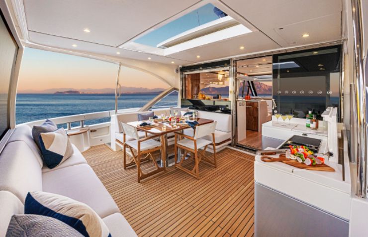 Il pozzetto si presenta come una vera “piazza” nautica: protetta, ampia, sfruttabile anche con meteo variabile. La connessione con il salone è progettata per trasformare l’area in un unico grande volume, grazie ad aperture generose e a una finestra cucina che facilita il servizio verso l’esterno. L’adozione di una cucina a U non è solo una scelta estetica: migliora l’operatività, aumenta gli appoggi e consente di lavorare con maggiore sicurezza quando la barca si muove.