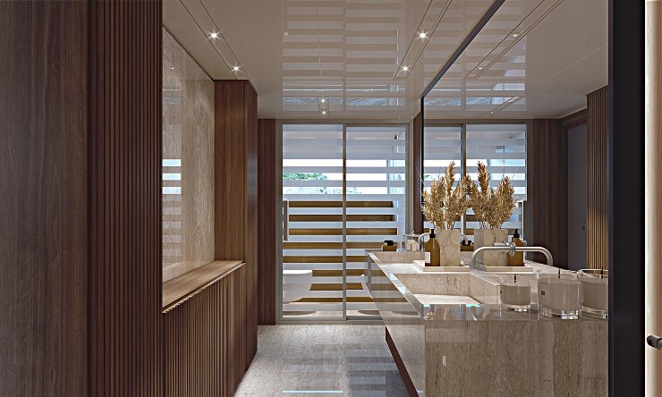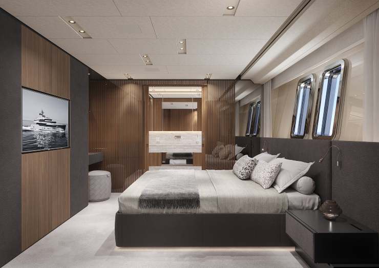 L’impronta esterna, sviluppata con uno studio di design internazionale, lavora su tre elementi: tagli orizzontali che alleggeriscono la sovrastruttura, vetrate continue per amplificare la luce naturale e piani-soglia che trasformano la vita a bordo (terrazze apribili, beach club perimetrale, lounge di prua). La suite armatoriale, vero statement, si articola come un appartamento che attraversa più livelli: zona notte, living privato, spazi en plein air e — ove richiesto — plunge pool dedicata.