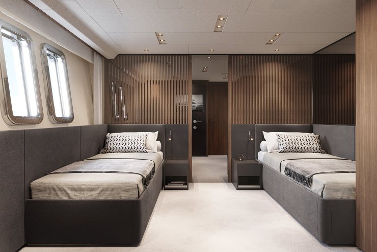 L’allestimento interno è totalmente adattabile: dalla matericità calda (legni naturali, tessili tecnici ad alte prestazioni, metalli spazzolati) alla purezza monomaterica. Le scale sono concepite come elementi scultorei che guidano lo sguardo, i giunti tra superfici nascondono dilatazioni e ispezioni. Le cabine ospiti mantengono bagni con superfici composite leggere, rubinetterie di fascia alta e, ove richiesto, docce a tutta larghezza. L’acustica è curata tramite strati massa-molla-massa su paratie e cielini disaccoppiati.
