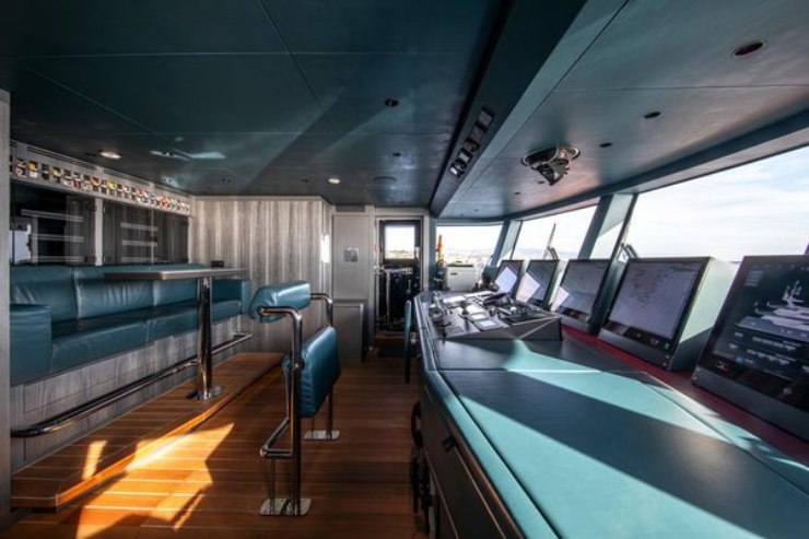 La plancia adotta un Integrated Bridge System con ridondanze fisiche e logiche: doppio chartplotter, radar con ARPA, ecoscandaglio multifrequenza, autopilota con interfaccia al sistema di stabilizzazione e rete CAN-bus/NMEA che alimenta la pagina conning su monitor di classe. Il monitoraggio impianti è centralizzato: pompe, serbatoi, luci tecniche, carichi elettrici, stati porta/aerazione e quadro allarmi sono gestiti da PLC e presentati su HMI dedicata.