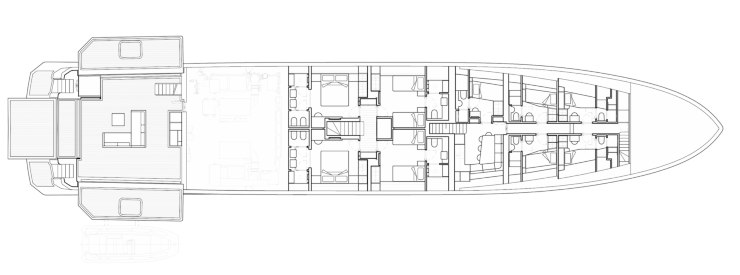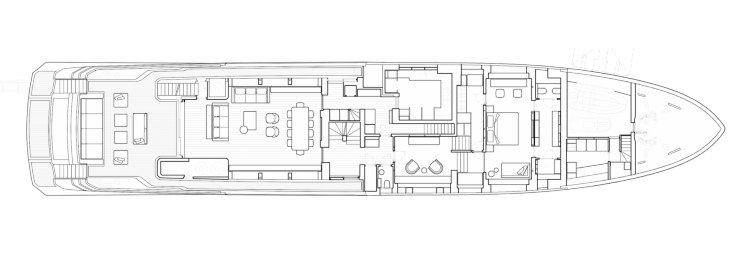 - Main deck: salone a tutta altezza, dining per dieci, lobby centrale, cambusa professionale isolata dai percorsi ospiti; verso prua l’appartamento armatoriale con studio, walk-in, bagno spa, terrazze e accessi esclusivi alle aree esterne.
