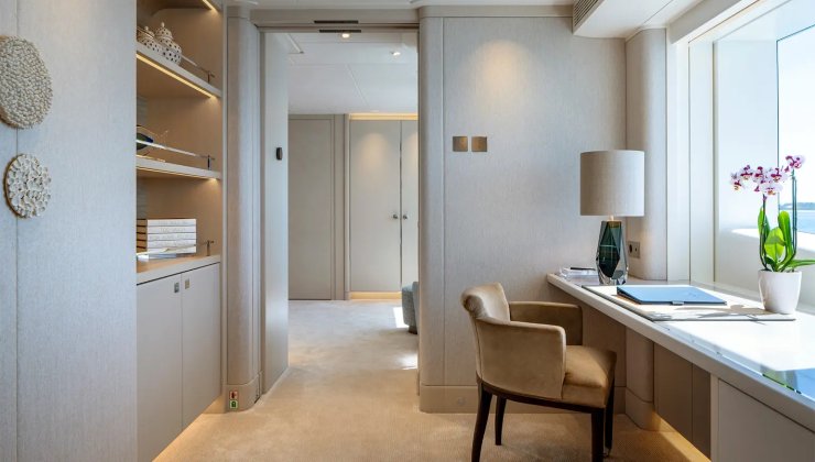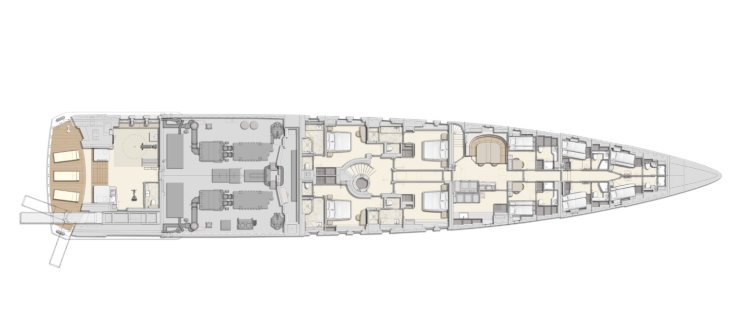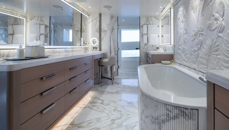 La zona di poppa, in prossimità del livello acqua, è la cerniera fra yacht e mare: spogliatoi, docce, day-head e spazi relax si combinano con piattaforme apribili. È uno spazio pensato per ospiti di età diverse, con percorsi antiscivolo e appigli intuitivi. L’illuminazione serale crea ambienti raccolti senza abbagliare; la vicinanza con i locali tecnici è mitigata da pareti e controsoffitti isolati.