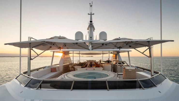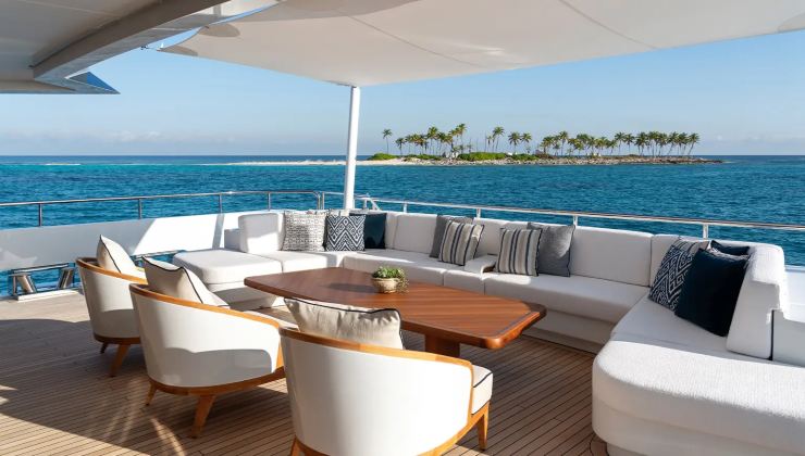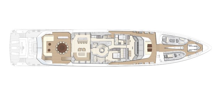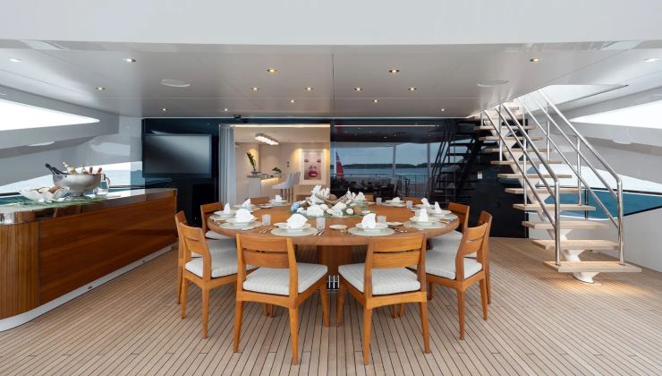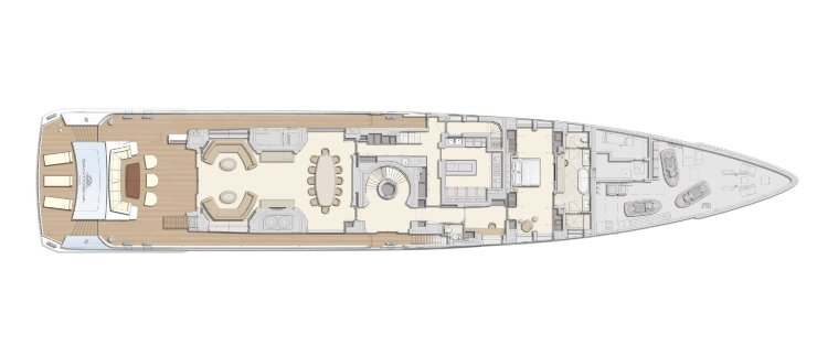 L’estetica esterna combina una prua affilata a una poppa fruibile sul livello acqua. Le aperture vetrate orizzontali ampliano la percezione della lunghezza e portano luce nei volumi interni. I ponti esterni sono pensati per transizioni fluide: pranzare a poppa riparati, sostare al sole in zone protette dal vento, scendere a mare senza attraversare percorsi d’equipaggio. Gli arredi outdoor privilegiano moduli leggeri e facilmente riconfigurabili, così da adeguare lo spazio a usi diversi nell’arco della giornata.