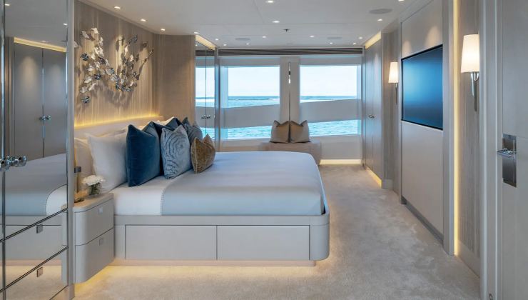 La distribuzione tipica include suite armatoriale a prua del ponte principale, salone e dining a poppa, sky lounge sul ponte superiore, beach club in basso e quattro o cinque cabine ospiti sul ponte inferiore, con equipaggio allineato a una dozzina di posti. Gli arredi fissi assicurano passaggi generosi e ripostigli accessibili; quelli mobili sono ancorati con sistemi che evitano vibrazioni e scricchiolii durante il moto.