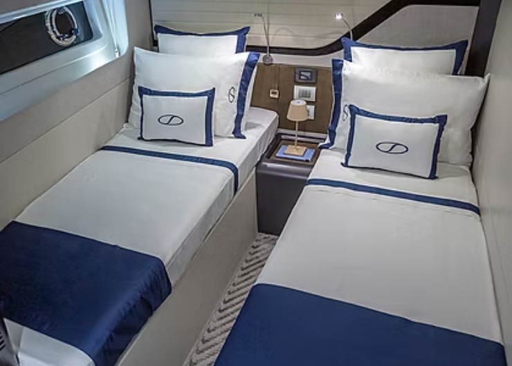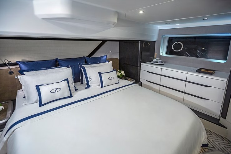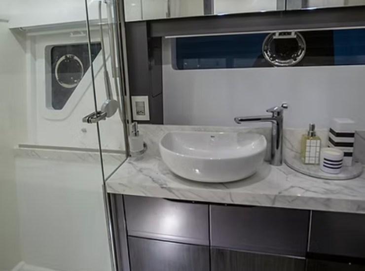 La zona notte si sviluppa attorno a una suite armatoriale e a cabine ospiti progettate per offrire privacy, ventilazione e spazi utili. La possibilità di configurare letti singoli trasformabili e di modulare il layout consente di adattare la barca a famiglie, gruppi di amici o uso charter. La vera qualità emerge nei dettagli: passaggi ampi, altezza percepita, armadi ben accessibili e bagni con docce realmente comode, non sacrificate.