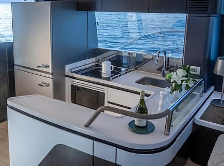 Il pozzetto della 600 è pensato come una sala da pranzo esterna vera, non come un semplice punto di passaggio. La presenza di una stazione cucina/bar dedicata e di superfici pensate per il servizio crea un ambiente che funziona con ospiti a bordo, senza dover spostare continuamente persone e oggetti. L’espansione laterale tramite balconi aumenta la sensazione di libertà e riduce l’effetto “corridoio”, migliorando anche la percezione di sicurezza quando la barca è in movimento o all’ancora con mare formato.