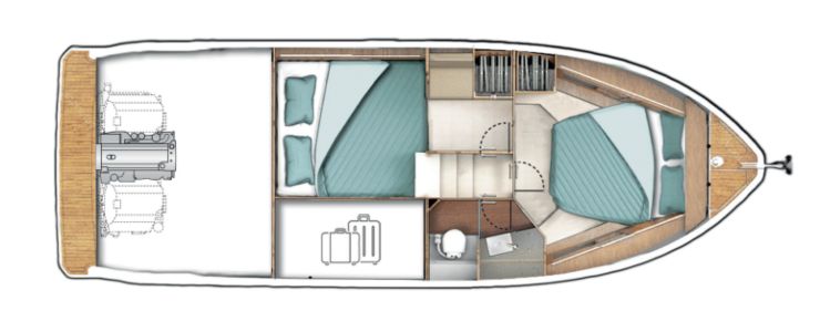 I propulsori sono abbinati a trasmissioni poppiere sterndrive, una soluzione che consente di ottimizzare il rendimento alle velocità di progetto, ridurre il pescaggio e migliorare la manovrabilità. L’orientabilità dei piedi poppieri permette infatti di modulare con precisione la risposta della barca in fase di ormeggio, specie in abbinamento a elica di prua e a eventuali sistemi elettronici di assistenza.