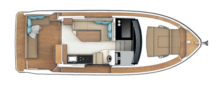 La visibilità è uno dei plus del modello: superfici vetrate ampie, montanti assottigliati e un sedile di guida regolabile permettono di mantenere un controllo visivo molto ampio, sia in navigazione sia nelle delicate fasi di ingresso in porto. La presenza di una porta laterale in timoneria consente inoltre al comandante di affacciarsi rapidamente in banchina durante le manovre, migliorando ulteriormente la percezione degli ingombri e dei punti di ormeggio.