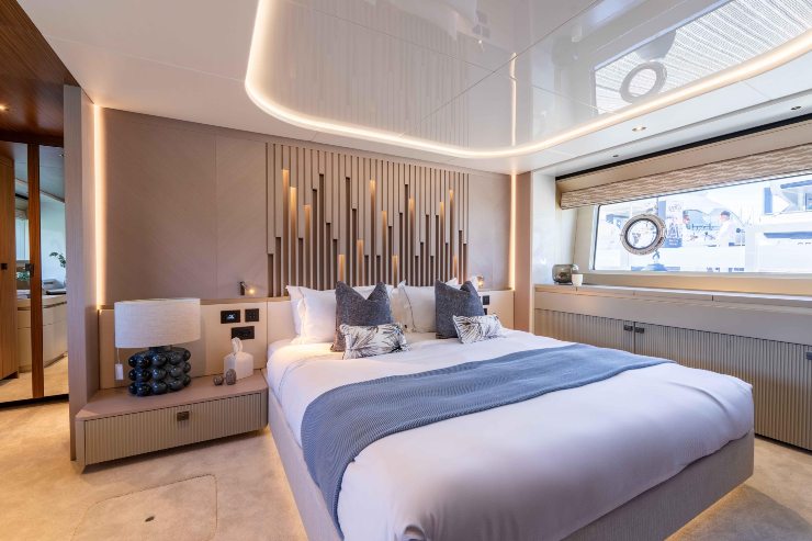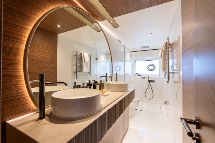 L’armatoriale si distingue per dimensioni e dotazioni: bagno en-suite con doppio lavabo, doccia indipendente e stivaggi capienti; la luce naturale arriva da vetrate laterali generose; i materiali sono scelti per resistere nel tempo, non solo per colpire alla prima visita. Le cabine ospiti – due matrimoniali e una doppia trasformabile, in configurazioni tipiche – mantengono altezze utili degne di imbarcazioni più grandi.