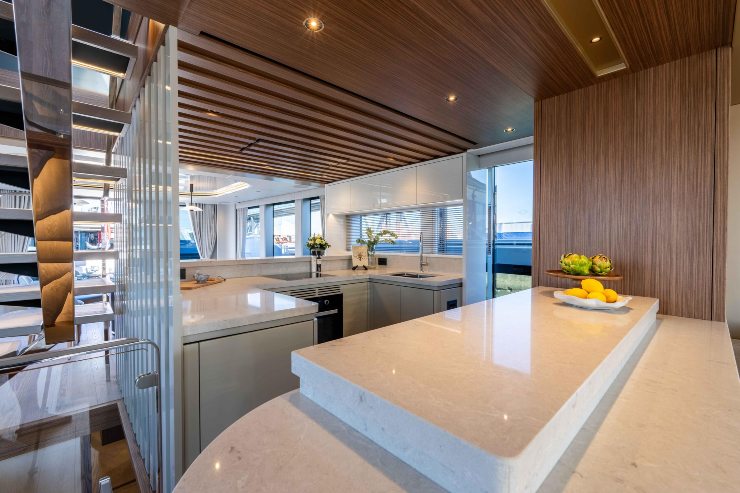 Il salone centrale è pianificato senza dislivelli per favorire la mobilità di tutti gli ospiti. La cucina, pensata anche per l’equipaggio professionale, dispone di percorsi “tecnici” separati: così il servizio non interferisce con la vita di bordo. L’isolamento acustico tra locali tecnici e zone notte è un punto forte: porte con guarnizioni doppie e pavimenti flottanti eliminano fischi e vibrazioni fastidiose.