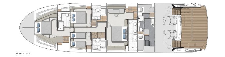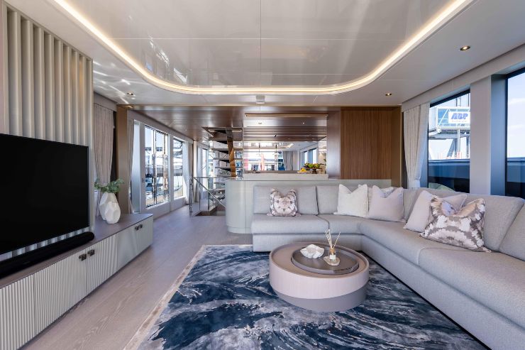 Il main deck può integrare la suite armatoriale in posizione rialzata, soluzione che libera volumi preziosi sul ponte inferiore. In alternativa, l’armatoriale a tutto baglio sottocoperta garantisce privacy e stabilità massima. La zona giorno è progettata come un’unica grande stanza modulare: cucina separabile, dining centrale, lounge affacciata verso il mare. Lo sky lounge del ponte superiore, grazie ai cristalli a tutta altezza, è la stanza jolly: sala cinema, ufficio, salotto privato o area giochi per i bambini. A prua, un bow lounge incassato consente fruizione anche in navigazione grazie alla protezione aerodinamica della tuga.