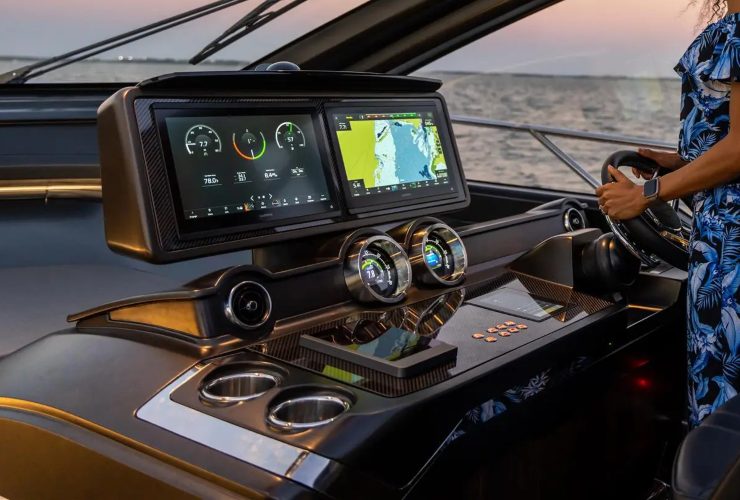 La timoneria adotta la logica “glass cockpit”: doppi MFD integrano cartografia, radar a compressione d’impulsi, ecoscandaglio, autopilota, interfaccia motori e centralina domotica. La gestione energetica si appoggia a un generatore dimensionato per carichi hotel e a pacchi batterie AGM o LiFePO4 (opzionali) che abilitano “silent mode” prolungate. La climatizzazione è suddivisa in zone con controlli indipendenti; pompe, luci, entertainment e pompe di sentina confluiscono in un bus di bordo che permette scenari d’uso preimpostati (giorno, notte, cinema, rada).
