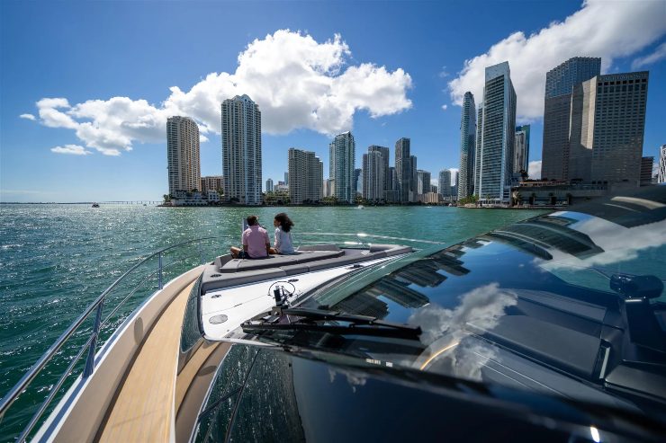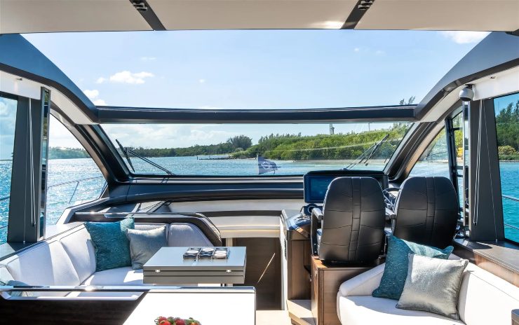 Il profilo è teso e ribassato, con ampie prese d’aria integrate e vetrate laterali profonde. L’hard-top scorrevole trasforma il main deck in un ambiente semi-aperto dove il passaggio tra pozzetto e salone è praticamente su un unico livello; il risultato è una galleria luminosa che prolunga la percezione dello spazio verso poppa. La plancetta—spesso idraulica—costruisce un piccolo waterfront privato: area tecnica per varo/alaggio del tender, ma anche “terrazza” sull’acqua quando la barca è ferma.