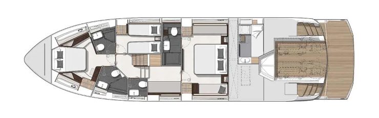 - Layout tipico: 3 cabine (opz. 4) + 4 bagni; cabina equipaggio dedicata