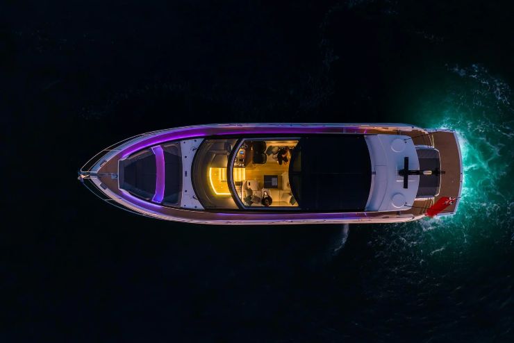 La climatizzazione a zone, abbinata a ventilazioni naturali assicurate dalla grande apertura dell’hard-top, taglia i picchi di assorbimento e allunga i periodi di “silent ship”. L’illuminazione LED a tonalità modulabile, orchestrata dalla domotica, aggiunge qualità percepita agli ambienti interni e riduce i consumi a parità di lumen erogati. Il pacchetto batterie evoluto, dove installato, permette notti intere senza generatore con luci attenuate, frigo in servizio e intrattenimento attivo.