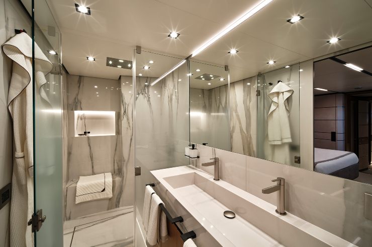 L’impianto di climatizzazione canalizzato, combinato con tecniche di isolamento avanzate, assicura temperature uniformi e ambienti acusticamente equilibrati. Le cabine, tutte con bagno privato, sono pensate per offrire spazi generosi e privacy anche durante lunghe permanenze a bordo.