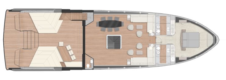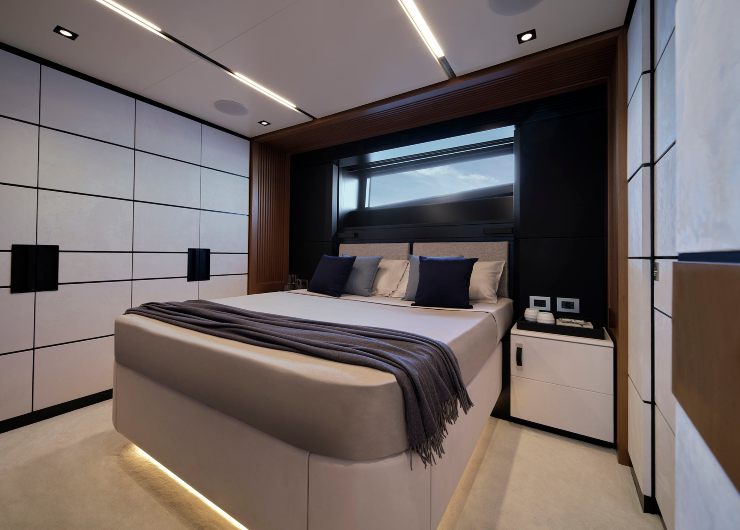 La suite dispone di ampi spazi per l’armatore, bagno privato, eventuali zone guardaroba separate e una disposizione degli arredi che privilegia l’orientamento verso il mare. Il design degli interni bilancia materiali naturali e superfici morbide per generare un’atmosfera raffinata, rilassante e mai eccessiva.