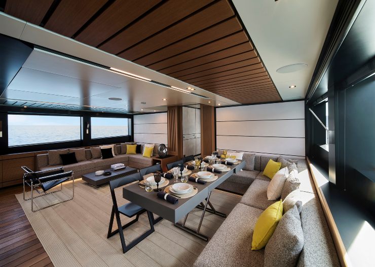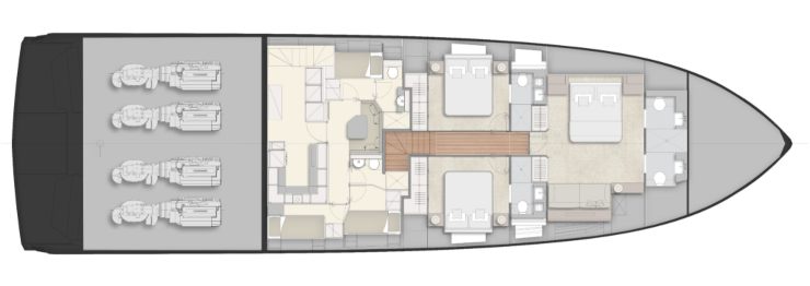 Il ponte superiore ospita la plancia e un ampio sky lounge che può fungere da sala da pranzo panoramica, zona cinema, lounge privata o area multifunzione. Il sundeck, configurabile con jacuzzi, prendisole e arredi modulari, offre un punto di osservazione privilegiato durante la navigazione o all’ancora.