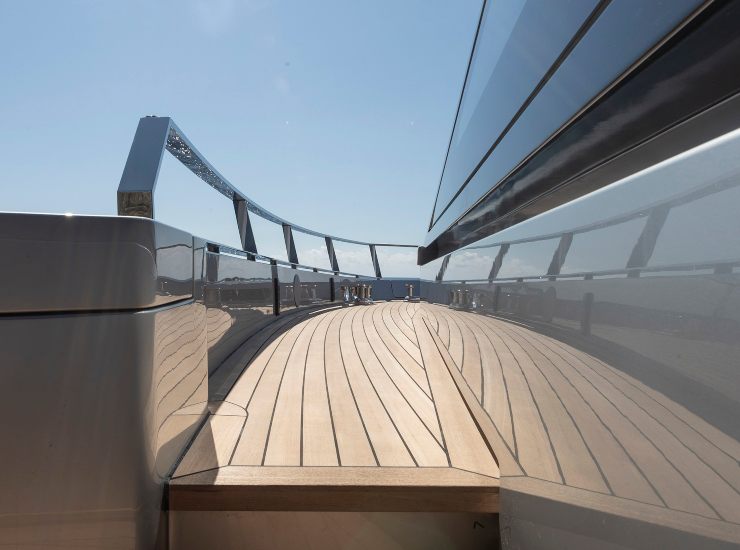 Questa architettura richiede soluzioni ingegneristiche avanzate: telai irrigiditi, schemi strutturali rinforzati e un attento bilanciamento dei pesi per mantenere il baricentro in una posizione ideale. Le grandi superfici vetrate della prua, che caratterizzano fortemente il profilo dello yacht, sono dotate di stratificazioni multiple e supporti strutturali integrati per resistere ai carichi dinamici delle navigazioni d’altura.