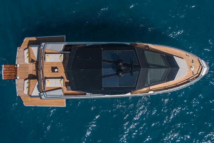 La sovrastruttura, caratterizzata da linee molto verticali e superfici finestrate estese, utilizza materiali compositi con resine vinilestere, che offrono un’ottima resistenza all’osmosi e permettono una modellazione precisa dei volumi. Gli interni sono il risultato di un approccio architettonico moderno: legni pregiati, finiture tessili di fascia alta, pannellature tattili e soluzioni di arredo personalizzabile contribuiscono a creare ambienti dall’eleganza misurata e contemporanea.