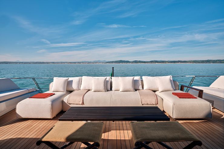 I camminamenti laterali sono stati studiati per facilitare i movimenti sia dell’equipaggio sia degli ospiti, garantendo un flusso ottimale tra le varie zone esterne. La prua, grazie al volume pieno del main deck, ospita un’area lounge generosa e perfetta per momenti di privacy, con arredi outdoor modulari e zone prendisole multiple.